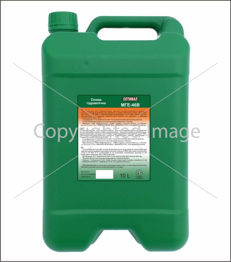 МГЕ-46В – Гідравлічна високоякісна мінеральна олія призначена для гідравлічних систем та гідростатичних приводів сільськогосподарської, будівельно-дорожньої техніки. Виробляється Гідравлічна олія на основі високоочищених базових масел-компонентів із застосуванням пакета, що містить антиокислювальну, протизносну, антикорозійну та ін. Присадки останнього покоління. Застосовується як робоча рідина в гідроприводах, гідропередачах та циркуляційних масляних системах різних агрегатів, машин і механізмів, що входять до складу обладнання промислових підприємств, сільськогосподарської, будівельної, дорожньо-будівельної техніки.